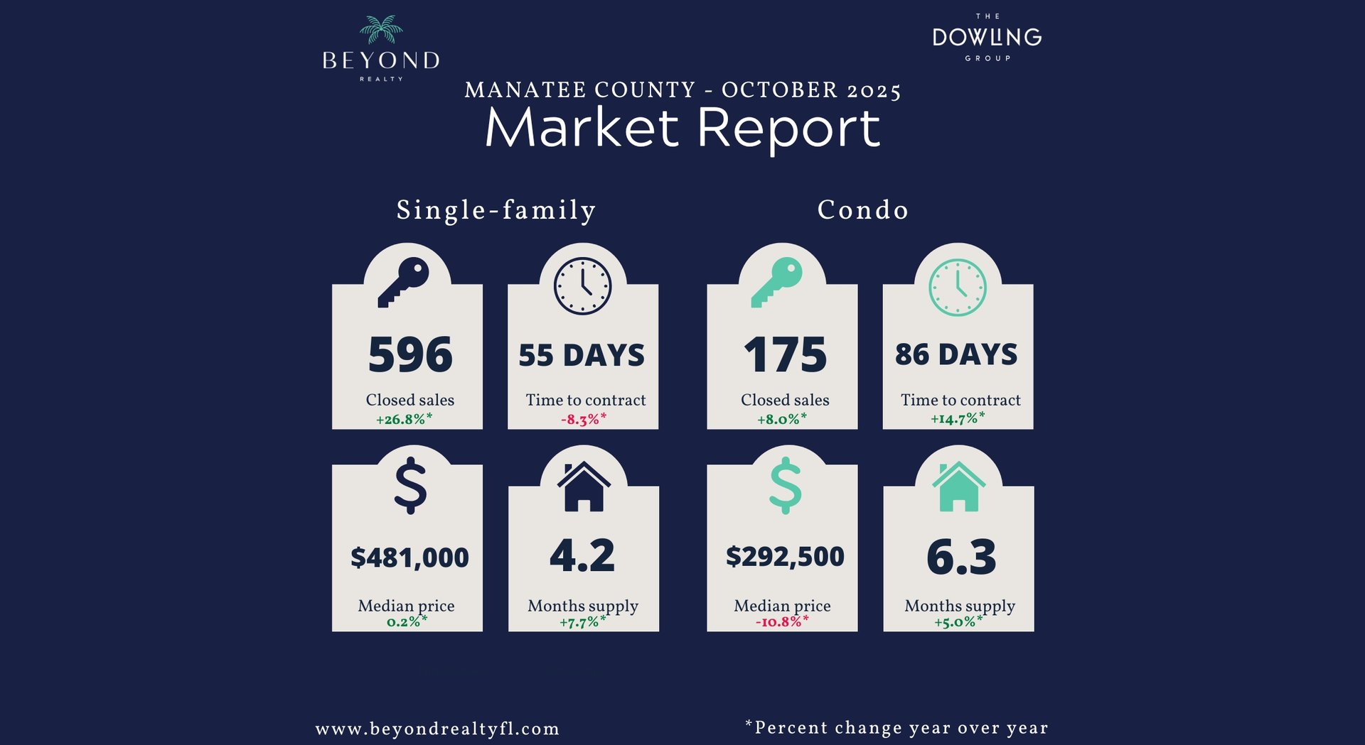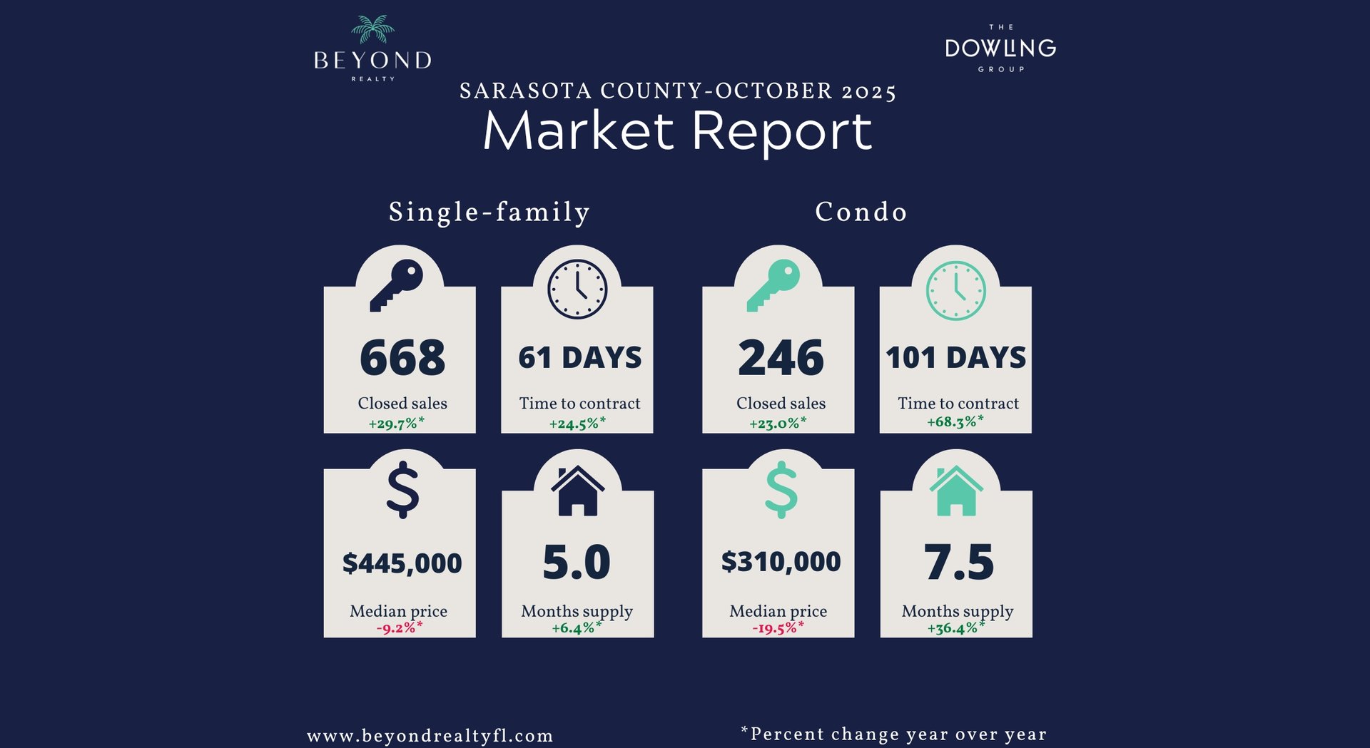 While year-over-year statistics show impressive gains, they must be viewed within the context of October 2024’s hurricane disruptions. More recent trends indicate a market that is gradually normalizing, with steady inventory, softening prices, and improving consumer activity.