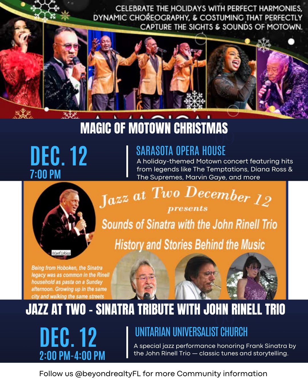 A smooth, classic afternoon concert featuring the John Rinell Trio performing a Sinatra-themed holiday set. Enjoy timeless standards in a cozy, intimate venue — a perfect pre-weekend musical treat.