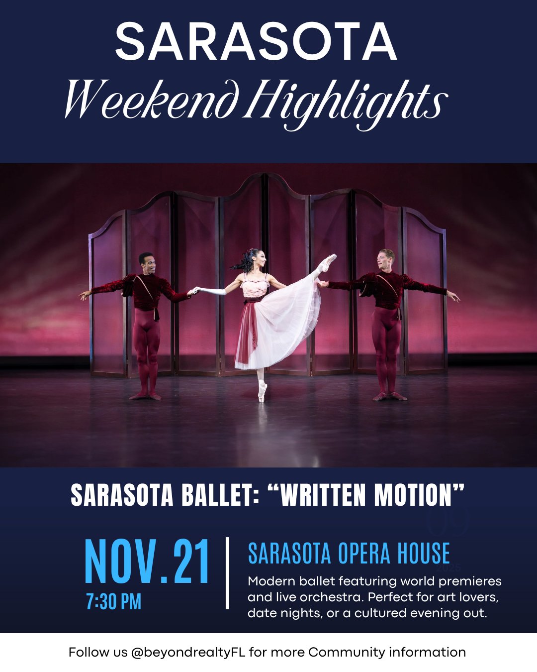 If you're looking for a vibrant, culture-rich weekend in Sarasota or Lakewood Ranch, you’re in luck. From Nov 21–23, 2025, the region is alive with events: world-class ballet, community fun, a Mustang car show, gourmet grilled cheese, and festive holiday lights. Whether you're a local or thinking of relocating, this weekend has something for everyone in #Sarasota, #LakewoodRanch, #Manatee, and #Charlotte counties.